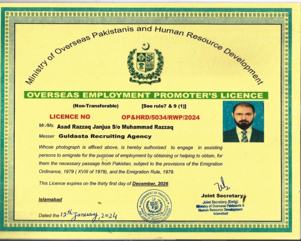 Guldasta Recruiting Agency is officially licensed and recognized by the relevant government authorities to provide overseas recruitment services. With full compliance to the laws and regulations of both the home country and destination countries, we ensure that all recruitment activities are conducted ethically, transparently, and professionally.